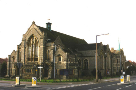 New matching stone front extension with ramped access from pavement and car park levels, housing single building entrance area and Church office constructed to replace twin front and side entrances,.